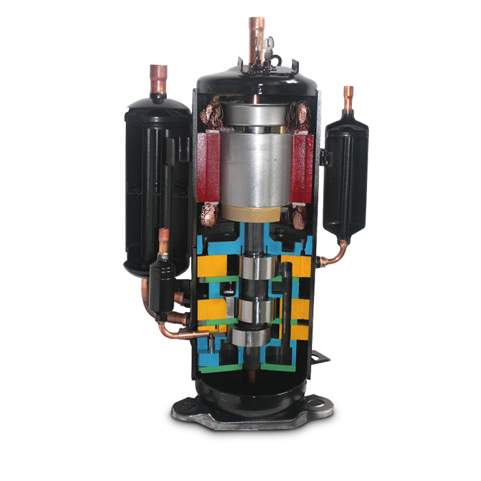 三缸雙級(jí)變?nèi)莘e比壓縮機(jī)可實(shí)現(xiàn)兩 種不同容積比的雙級(jí)壓縮,可降低單個(gè)氣缸的壓縮比,減小了 泄漏量,提高了壓縮機(jī)的容積效率,與單級(jí)壓縮系統(tǒng)相比,雙 級(jí)增焓壓縮系統(tǒng)具有能力高、能效高和可靠性高的優(yōu)勢(shì),使用 在家用熱泵空調(diào)、多聯(lián)式熱泵空調(diào)、戶(hù)用冷水熱泵機(jī)組等多種 類(lèi)型的熱泵產(chǎn)品中。